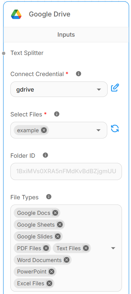 Google Drive is a cloud storage and file synchronization service. This module provides functionality to load and process files from Google Drive, supporting various file formats and Google Workspace documents. This module provides a sophisticated Google Drive document loader that can: * Load multiple file types * Process Google Workspace documents * Handle folder-based loading * Support shared drives * Process files recursively * Customize file type filtering * Handle OAuth2 authentication ### Required Parameters * **Connect Credential**: Google Drive OAuth2 credentials. Refer to [#Google Drive](../tools/google-drive.md) * **Select Files** or **Folder ID**: Choose specific files or provide a folder ID ### Optional Parameters * **File Types**: Types of files to load: * Google Docs * Google Sheets * Google Slides * PDF Files * Text Files * Word Documents * PowerPoint * Excel Files * **Include Subfolders**: Process files in subfolders * **Include Shared Drives**: Access files from shared drives * **Max Files**: Maximum number of files to load (default: 50) * **Text Splitter**: A text splitter to process the extracted content * **Additional Metadata**: JSON object with additional metadata * **Omit Metadata Keys**: Comma-separated list of metadata keys to omit ## Outputs * **Document**: Array of document objects containing metadata and pageContent * **Text**: Concatenated string from pageContent of documents ## Supported File Types ### Google Workspace * Google Docs (application/vnd.google-apps.document) * Google Sheets (application/vnd.google-apps.spreadsheet) * Google Slides (application/vnd.google-apps.presentation) ### Microsoft Office * Word (.docx) * Excel (.xlsx) * PowerPoint (.pptx) ### Other Formats * PDF (.pdf) * Text Files (.txt) ## Features * OAuth2 authentication * Multiple file type support * Folder processing * Shared drive access * File type filtering * Text splitting support * Metadata customization * Error handling ## Loading Methods ### File Selection Mode * Direct file selection * Multiple file support * File type filtering * Metadata preservation ### Folder Mode * Recursive folder processing * Subfolder support * File type filtering * Batch processing ## Document Structure Each document contains: * **pageContent**: Extracted content from the file * **metadata**: * fileName: Original file name * fileType: MIME type * fileId: Google Drive file ID * source: File path/URL * Additional custom metadata ## Notes * Requires OAuth2 authentication * Handles rate limiting * Supports large files * Temporary file management * Memory-efficient processing * Error handling for invalid files * Automatic token refresh