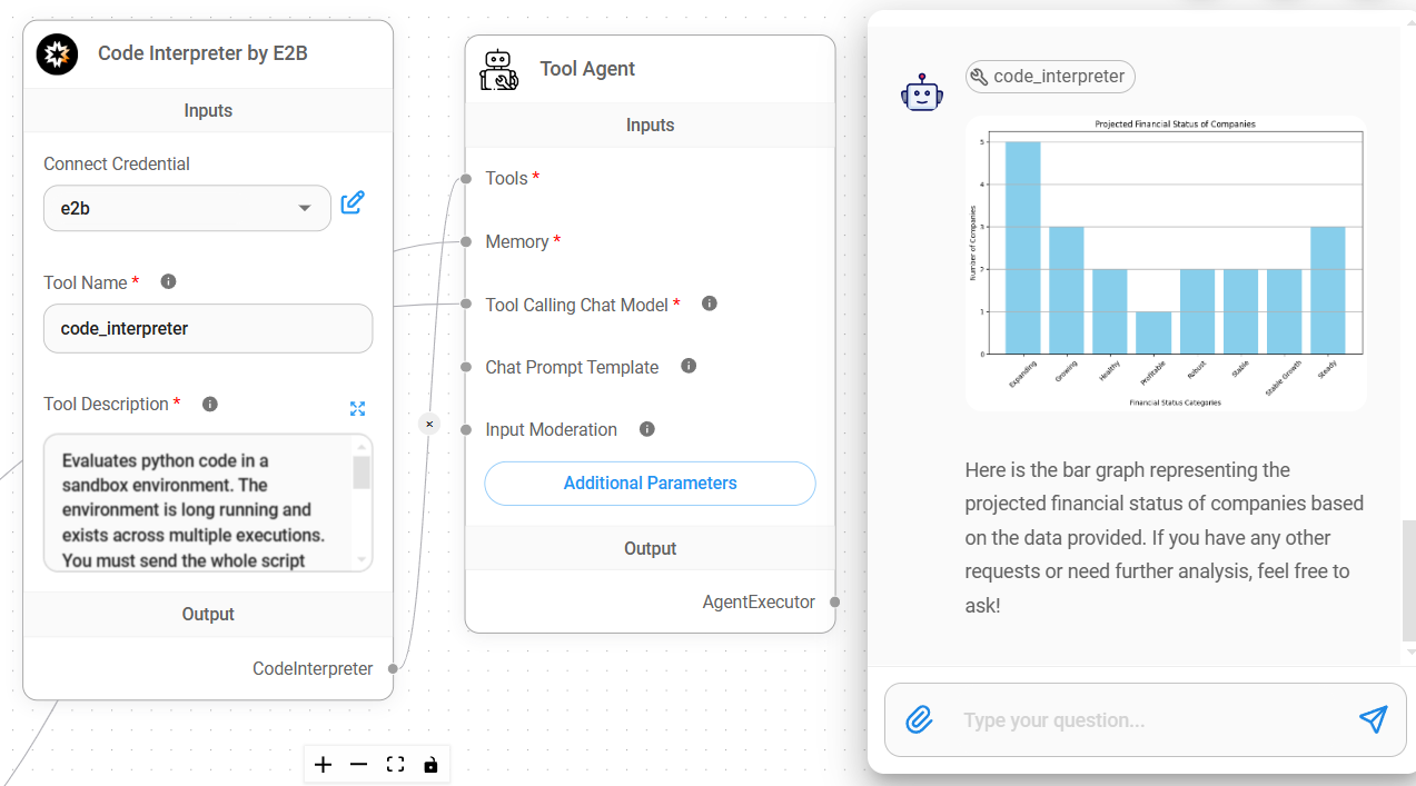 # Code Interpreter by E2B [E2B](https://e2b.dev/) is an open-source runtime for executing AI-generated code in secure cloud sandboxes. For example, when user asks to generate a bar graph of the data, LLM will output python code needed to plot the graph. This generated code will be sent to E2B, and the output of the execution will contains images of the graph, codes, text and etc. These outputs are sent back to LLM for final processing before getting displayed on the chat.