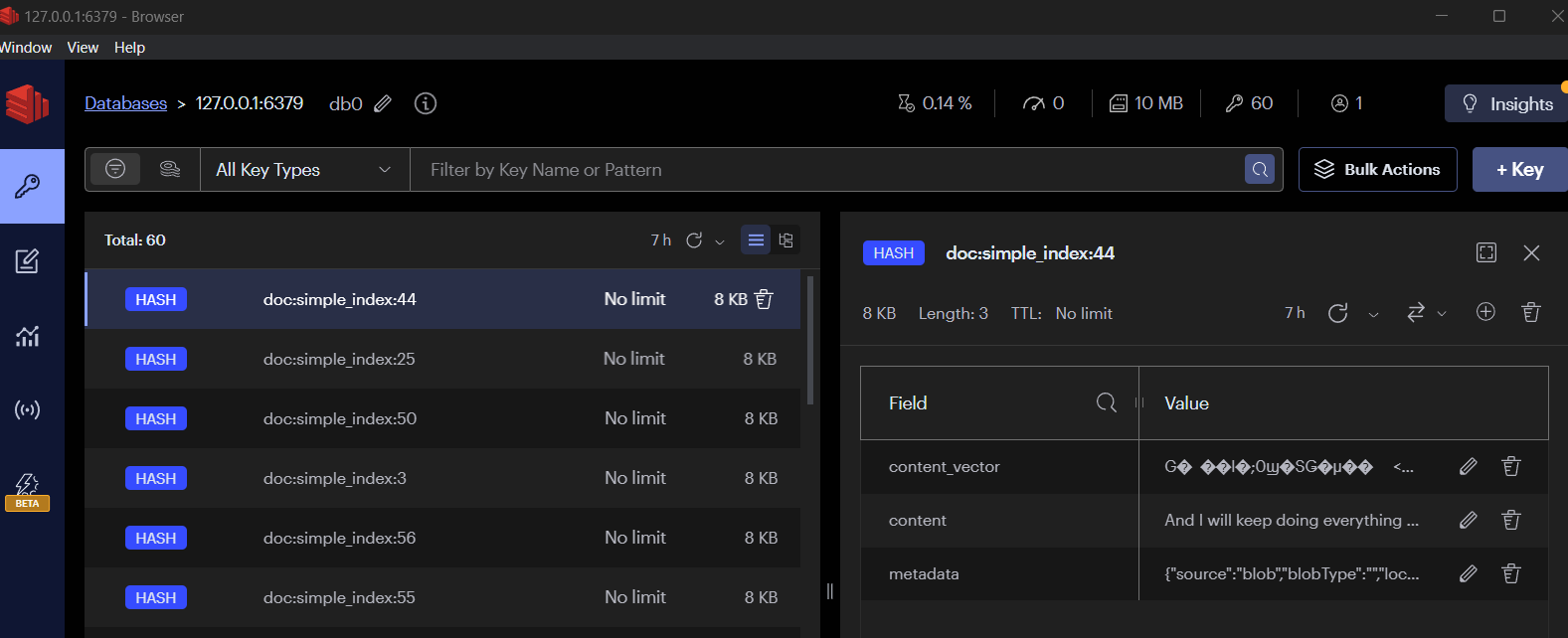 - Navigate to Redis Insight portal, and to your database, you will be able to see all the data that has been upserted:
