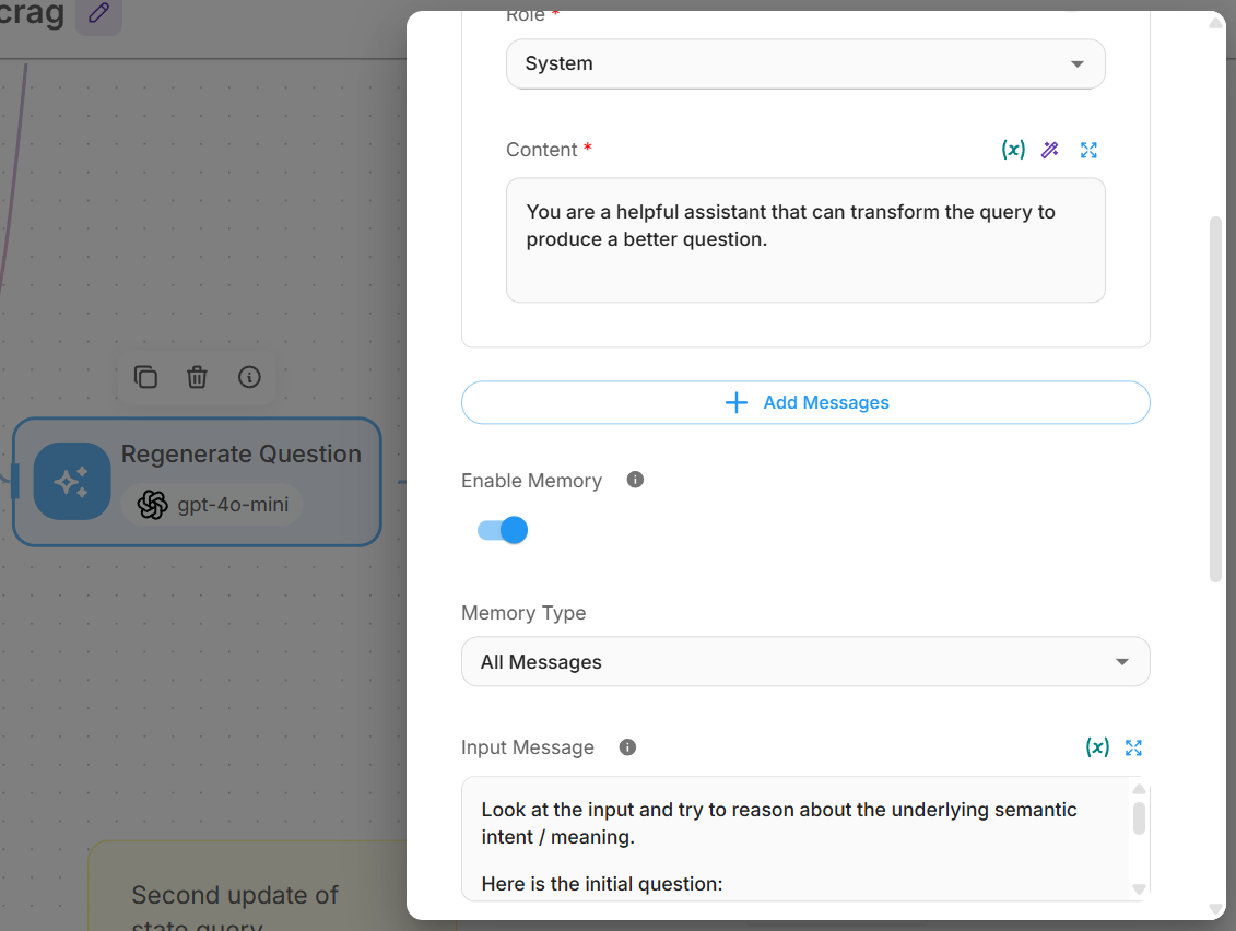 - Messages: Add system message: "You are a helpful assistant that can transform the query to produce a better question."