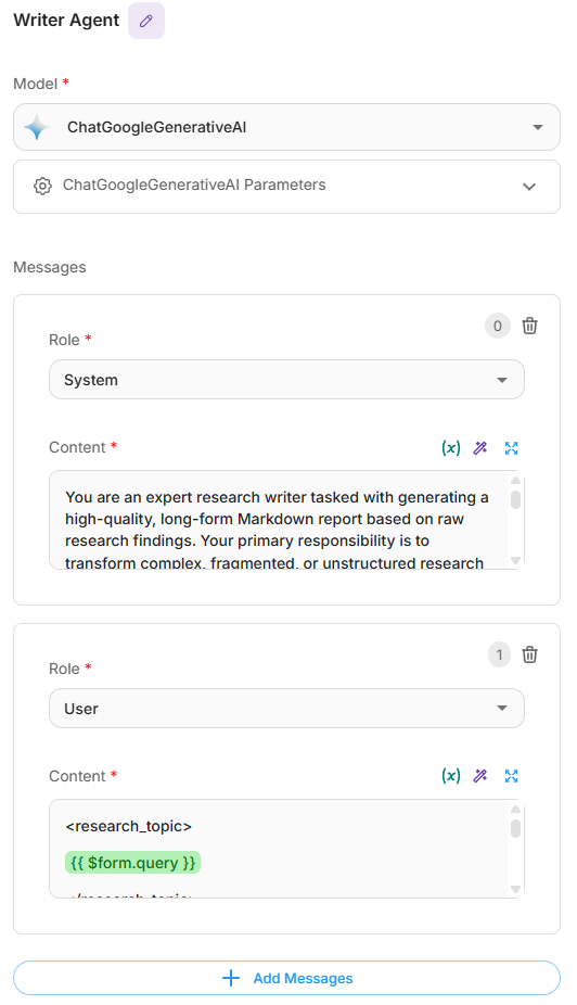 - Form Description: "A research agent that takes in a query, and return a detailed report"
