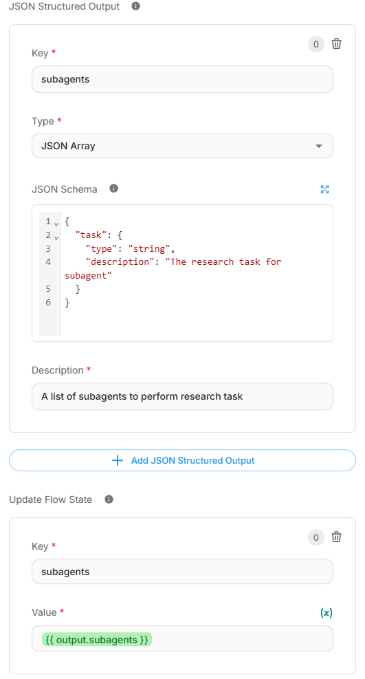 - Configure JSON Structured Output to return a list of subagent tasks: