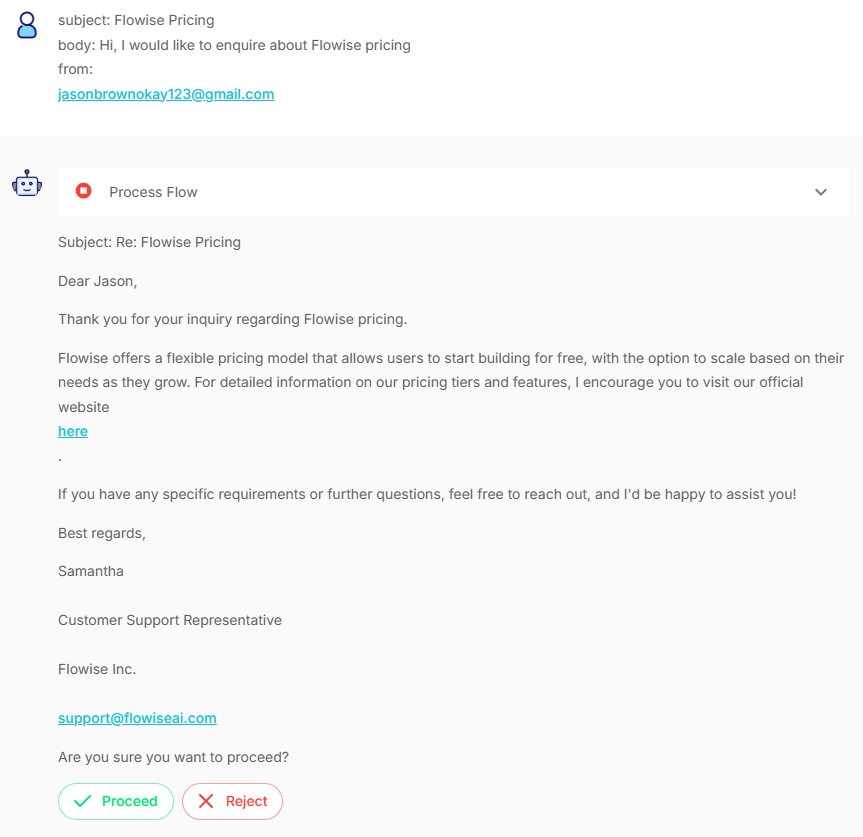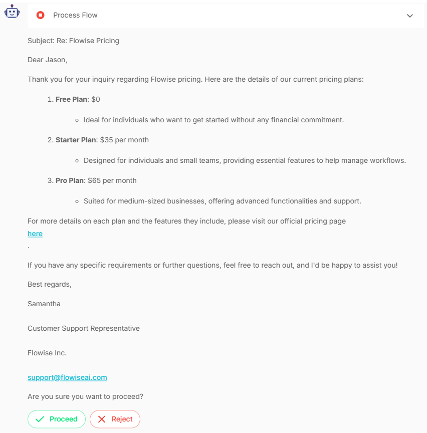 - Proceed: Approve the response and continue to email sending