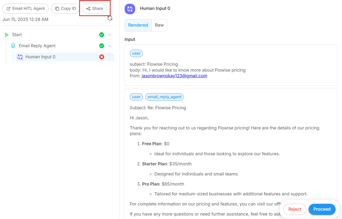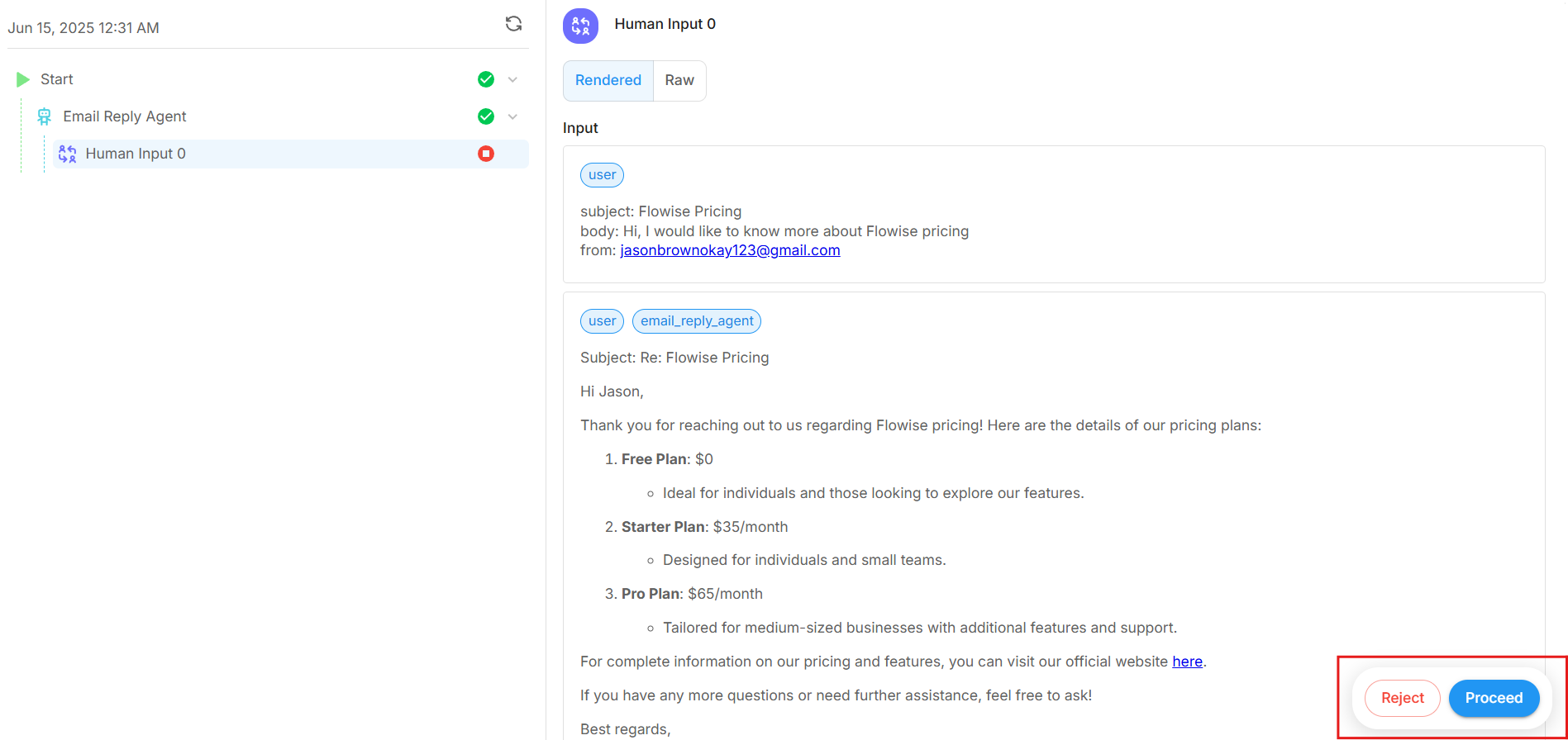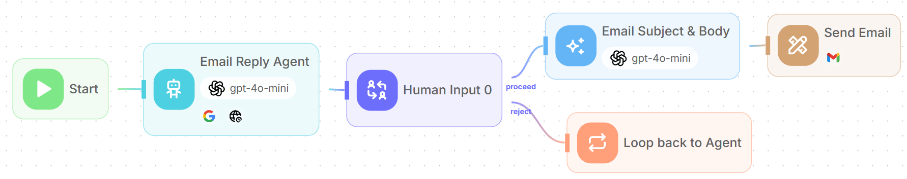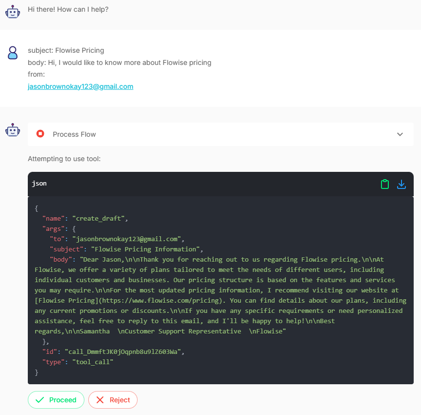 - Before the Agent creates the Gmail draft, it will ask the user for approval or rejection.