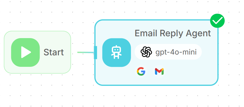 - Add an Agent node and connect it to the Start node. This agent will analyze the incoming email and generate an appropriate response.