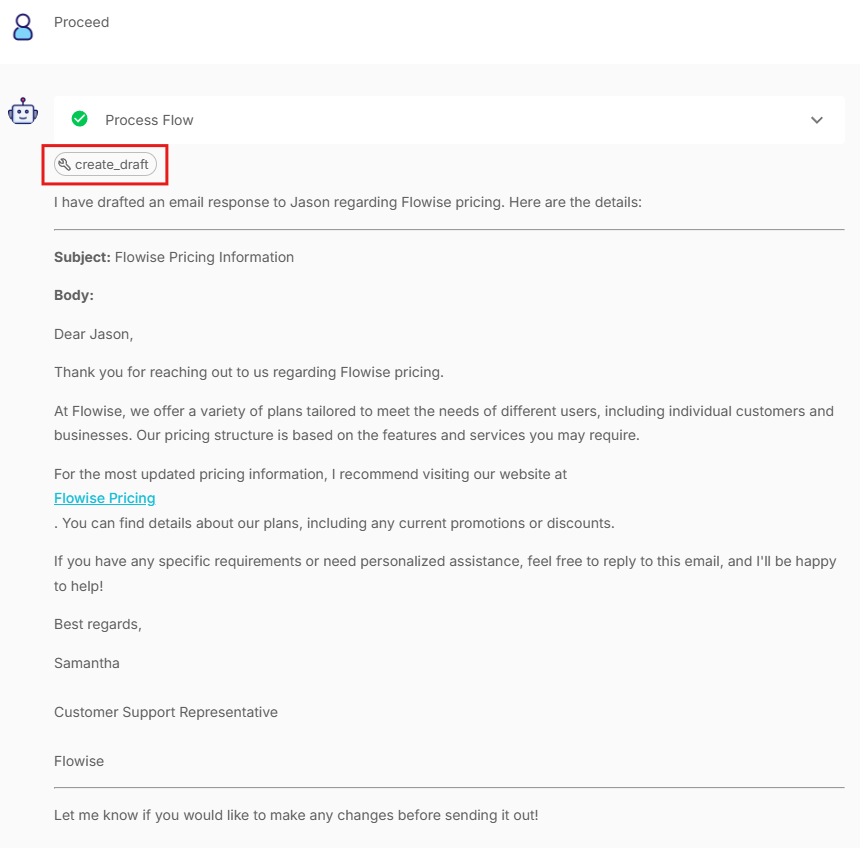 - If the tool is approved, the Agent will proceed to call the tool and create the draft in Gmail. The Agent is smart enough to determine the appropriate subject, body, and recipient for the email.