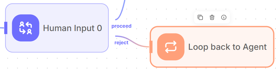 - Connect the "reject" output from the Human Input node to this Loop node. When a human rejects the response, the workflow will return to the agent with the feedback for improvement.