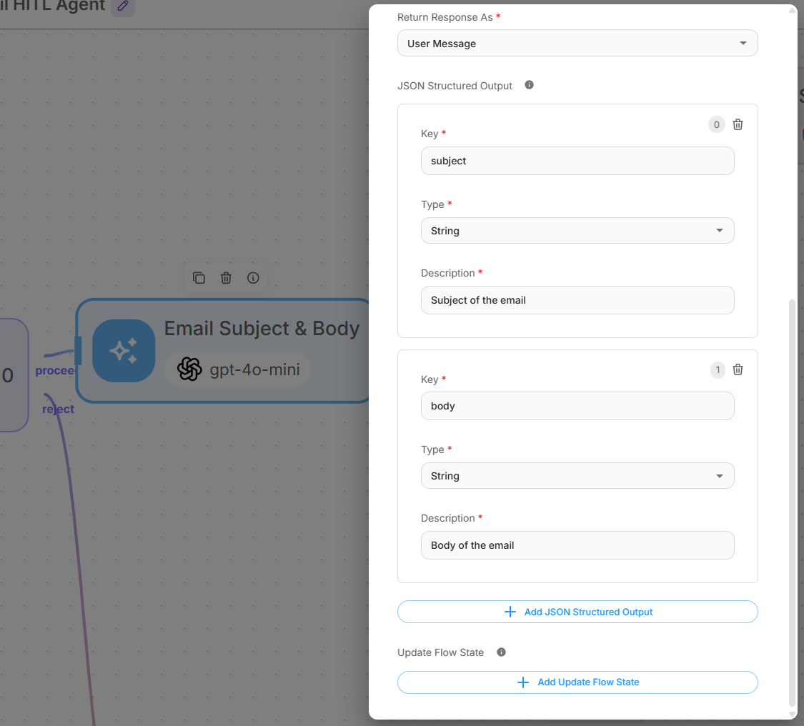 {{ llmAgentflow_0.output.subject }}to get the generated subject from Step 5 - body: Use