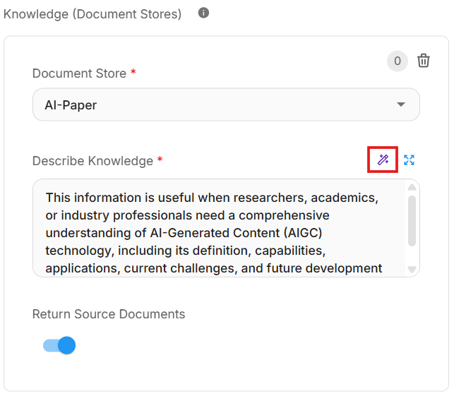 - Add a new Knowledge (Document Store) and define what the content is about. This helps the LLM understand when and how to retrieve relevant information. You can also use the auto-generate button to assist with this process.