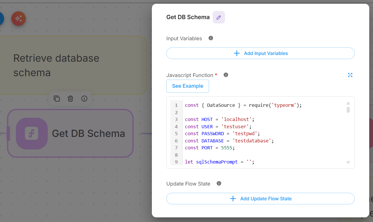 - Javascript Function: This is an example function that connects to your database and retrieves the complete schema including table structures, column definitions, and sample data.