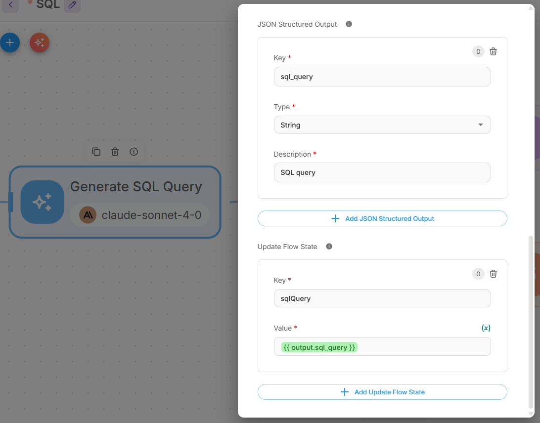 The Start node initializes the flow state with an empty sqlQuery variable that will store the generated SQL query throughout the process.