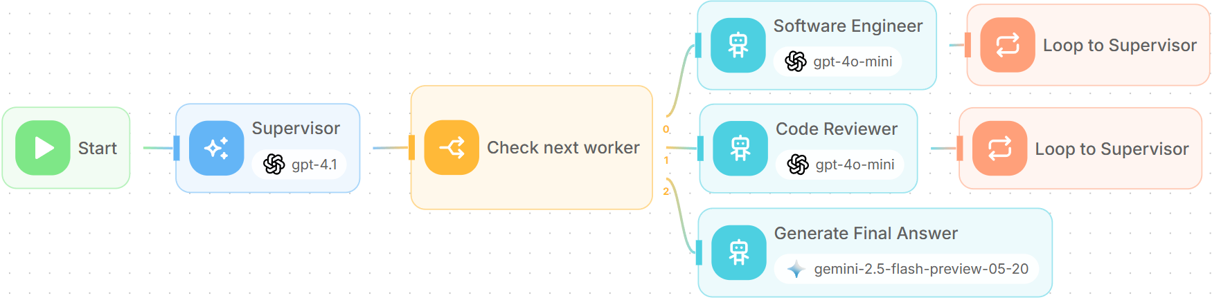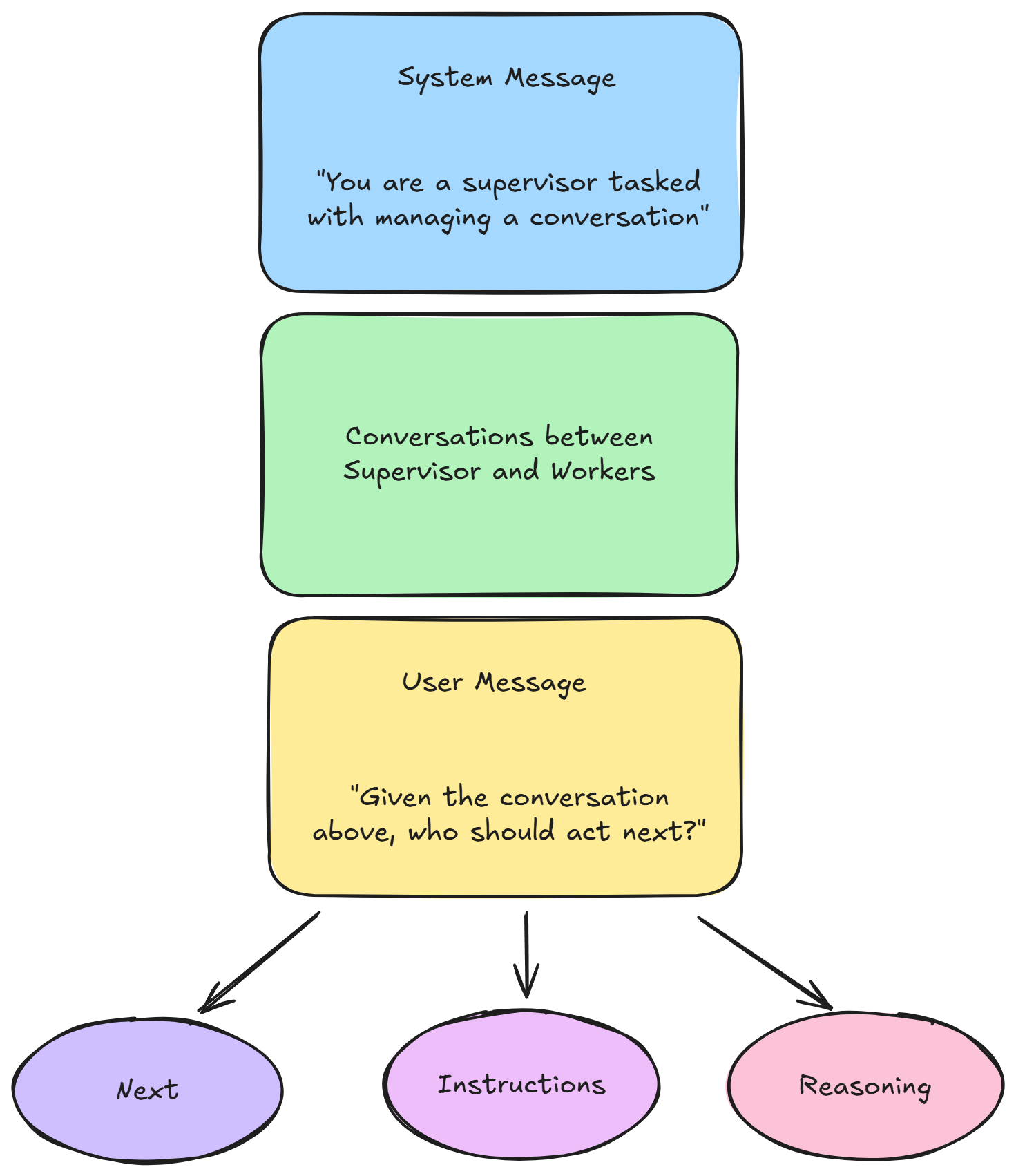 - Supervisor: An LLM that analyzes tasks and decides which worker should act next