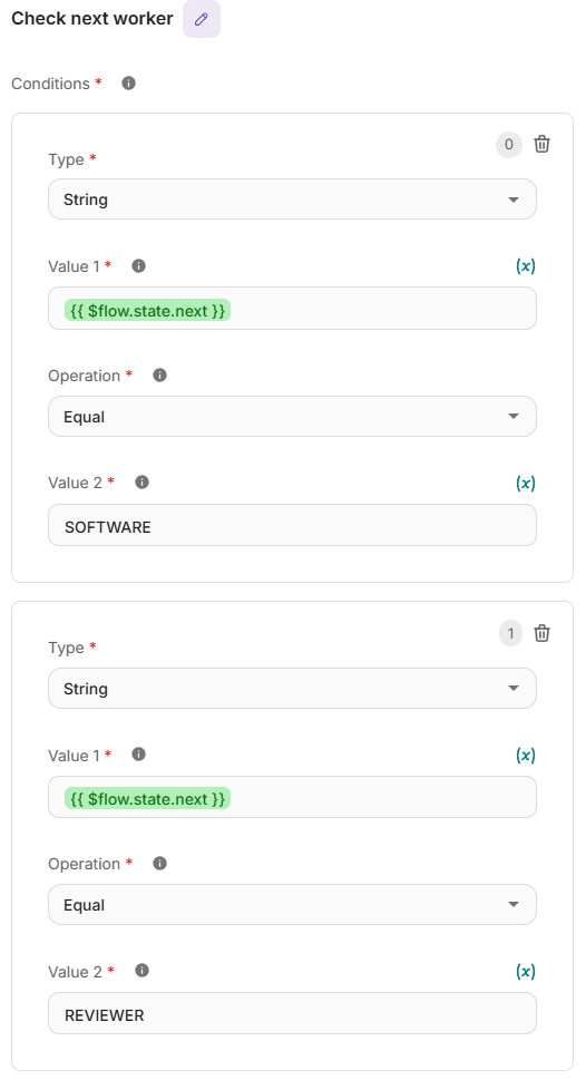 {{ $flow.state.next }}equals "SOFTWARE" - Condition 1: