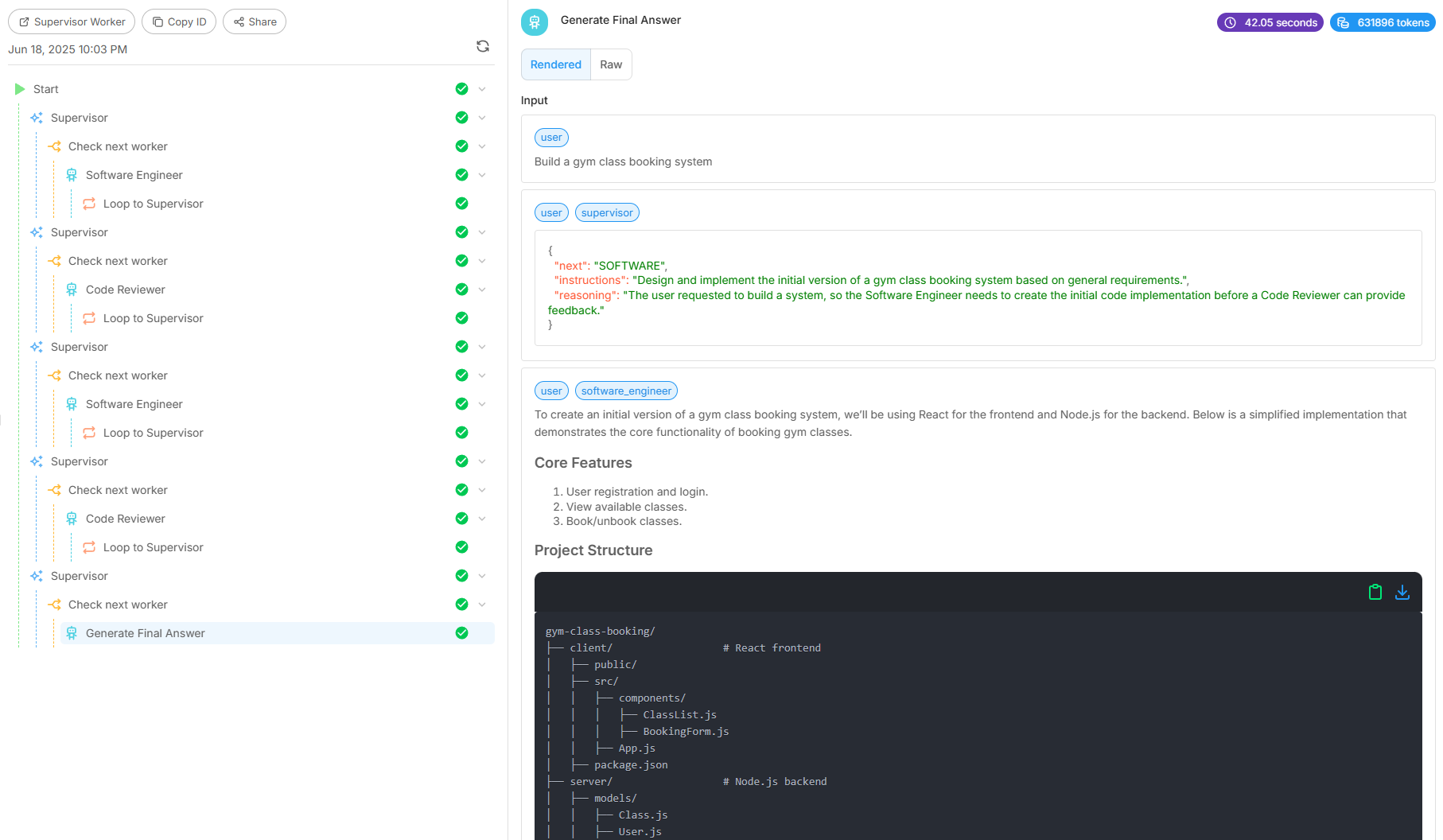 Stateful Coordination: The flow maintains state across iterations, allowing the supervisor to make informed decisions about what should happen next.