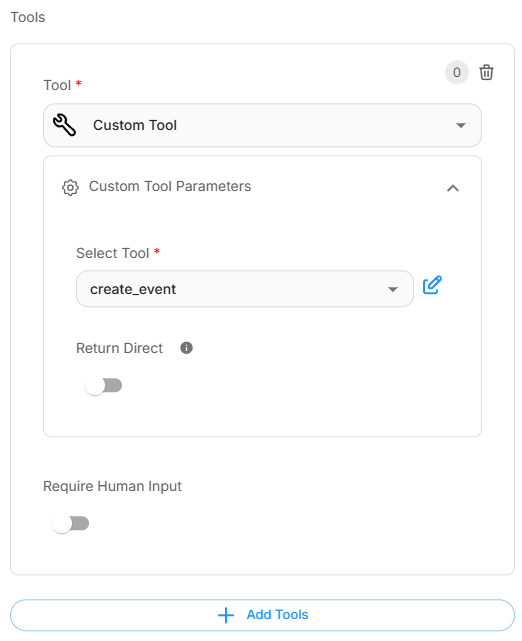 From the Tool dropdown, select the custom tool. You can also turn on Return Direct if you want to directly return the output from custom tool.