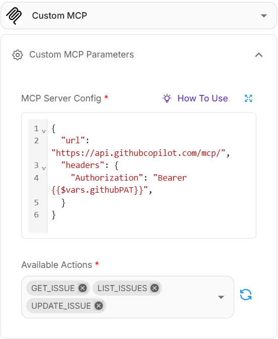 In order to access the MCP server, we need to create a Personal Access Token from Github. Refer to guide. Once PAT has been created, create a variable to store the token. This variable will be used in Custom MCP.