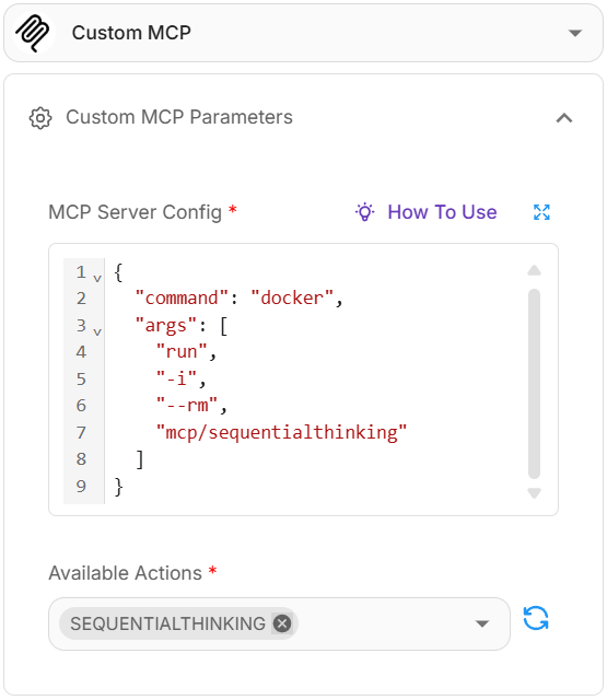 - Locate the MCP server configuration and add it to Custom MCP. For example: https://hub.docker.com/r/mcp/sequentialthinking