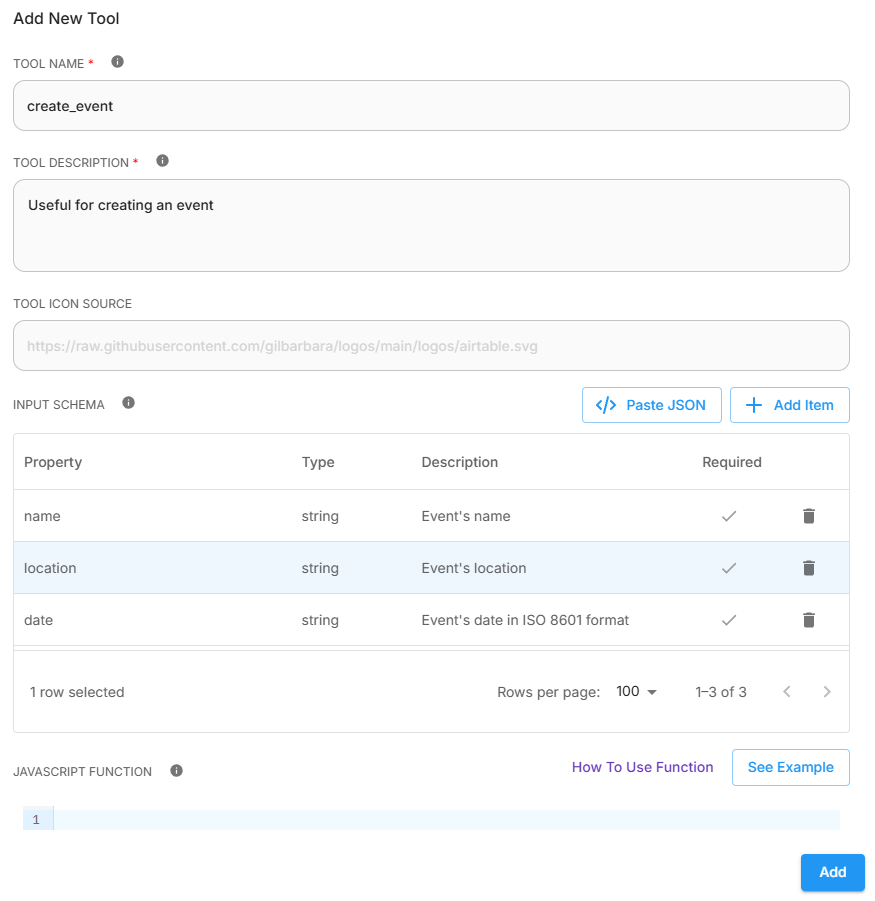 - Javascript Function: The actual function to execute once this tool is called